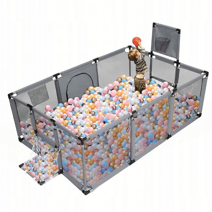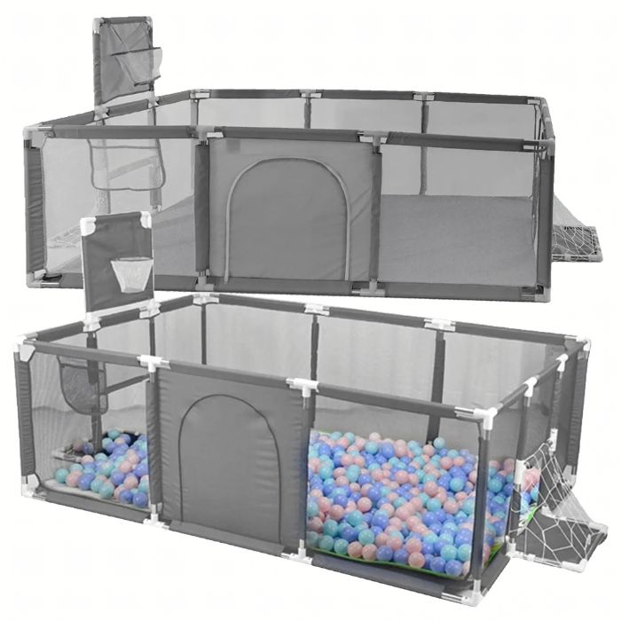 Kojec plac zabaw XXL to innowacyjne rozwiązanie, które przekształci każde pomieszczenie w prawdziwe centrum aktywności dla Twojego maluszka. Ten wielofunkcyjny kojec dla dzieci łączy w sobie funkcje suchego basenu z piłeczkami, boiska do piłki nożnej oraz kosza do koszykówki, oferując niekończące się możliwości zabawy i rozwoju.